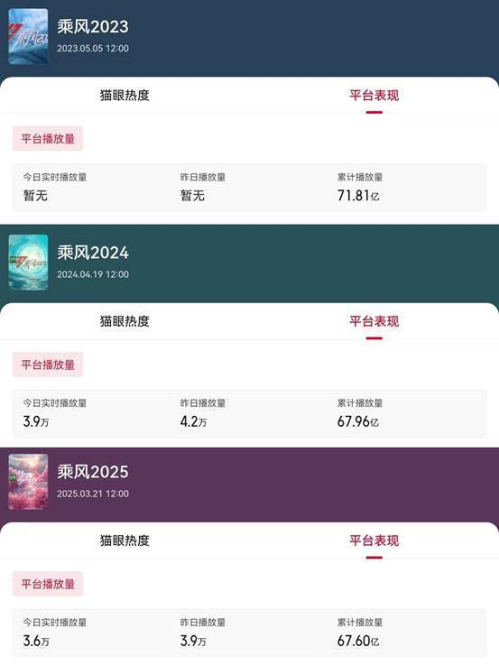 2023年累计播放量还有71.81亿,到了2024年就降到了67.96亿,去年67.6亿,下降幅度虽然不大,但依然在走下坡路。